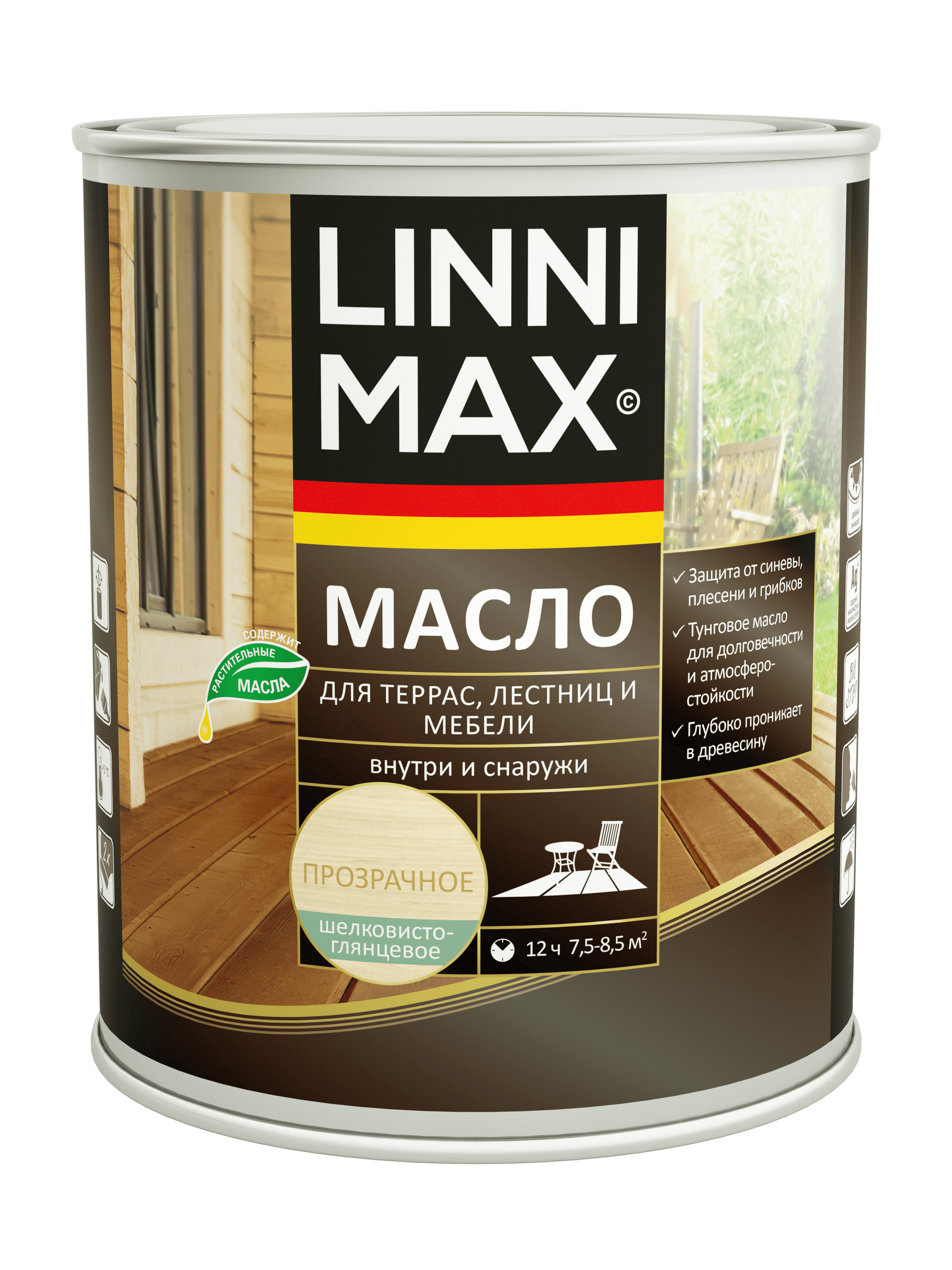 Износостойкое, атмосферостойкое, влагоотталкивающее алкидное террасное масло с содержанием воска.